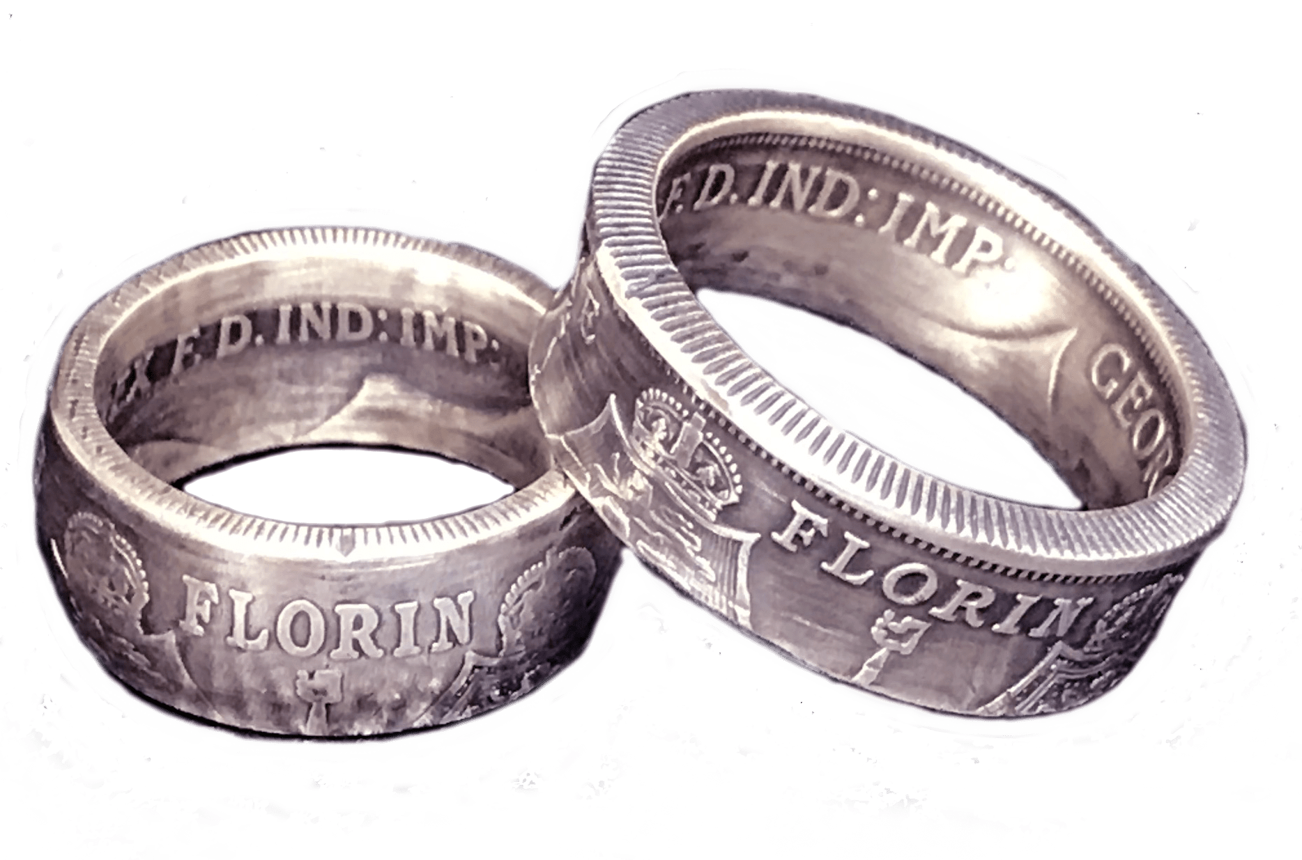 The British florin, or two shilling coin, was issued from 1849 until 1967. The sought after 1849–1919 coins boast a nice 92.5% Sterling Silver Content. These make wonderful “His and Her” rings because thew size range is similar to that of a JFK Half.